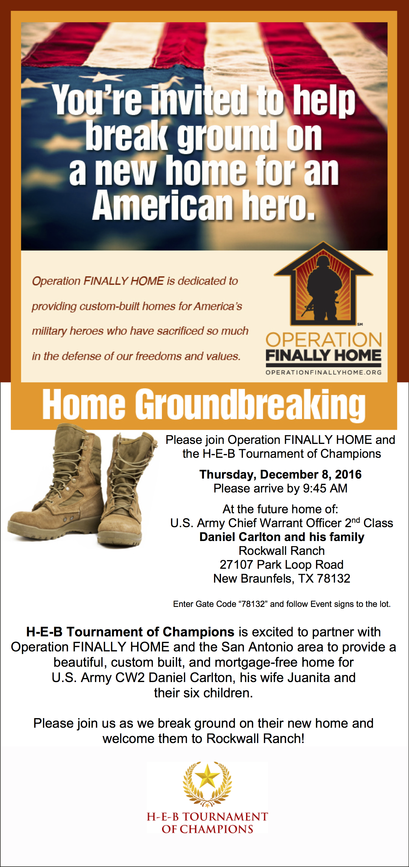 "Operation Finally Home" is conducting a Ground Breaking Ceremony for US Army Chief Warrant Officer 2nd Class Daniel Carlton, his wife Juanita and their six children. Finally Home has requested the presence and participation of the SA PGR in the procession and celebration in this glorious event.
