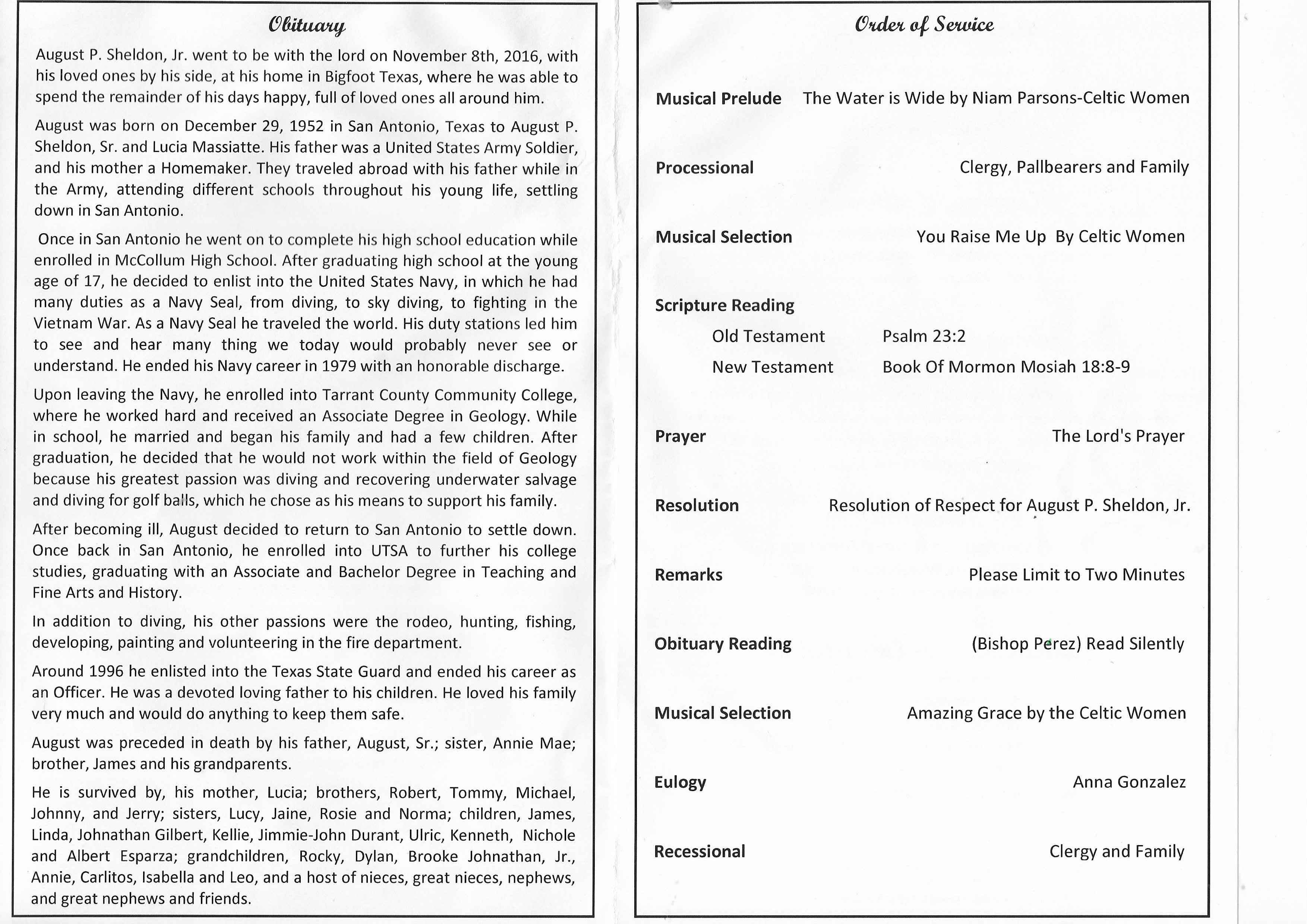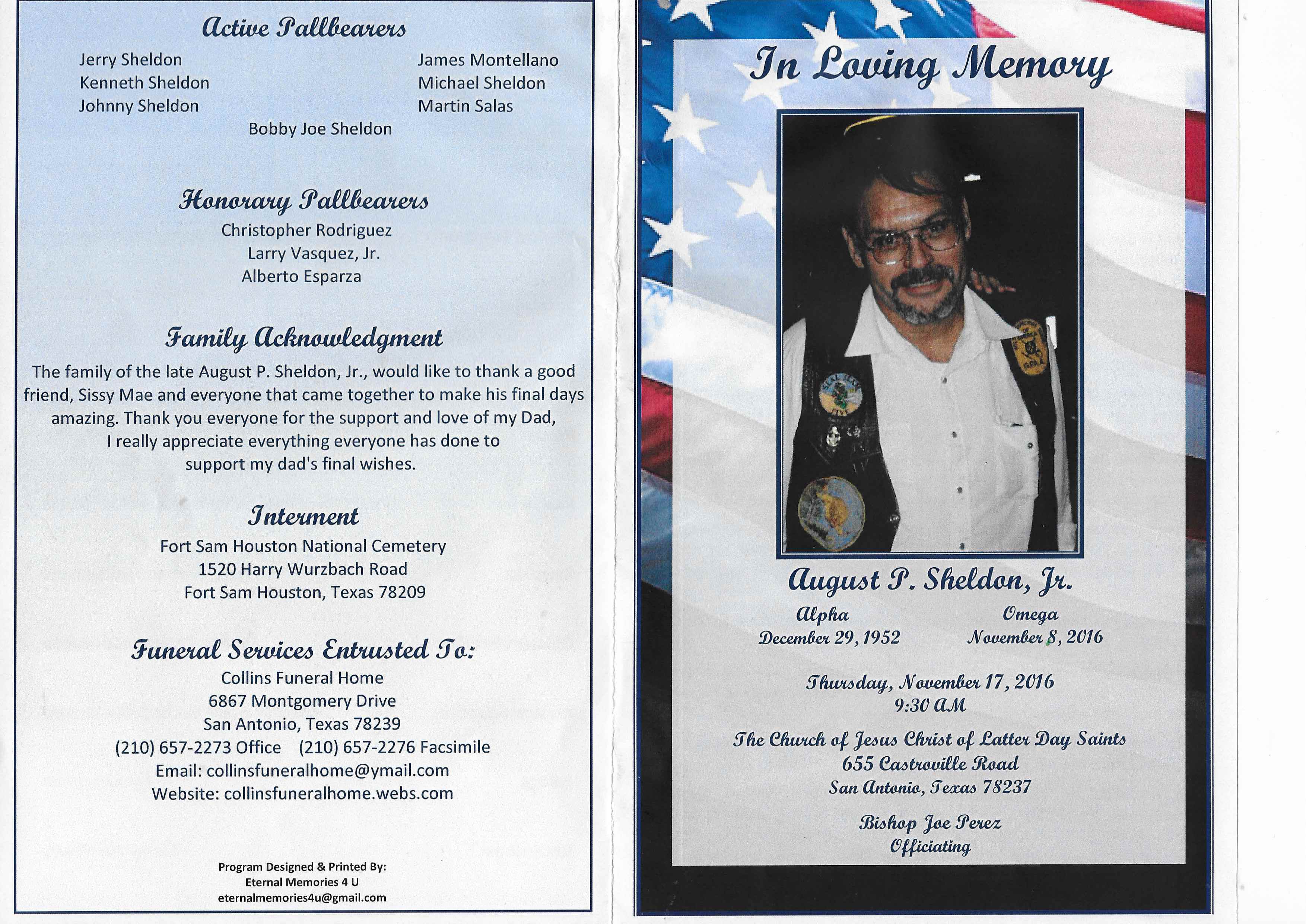 The family of August Sheldon Jr., a US Navy and Vietnam Veteran, requests the presence and participation of the San Antonio Patriot Guard at the services, LEO assisted procession, and graveside rendering of military honors of their loved one.
