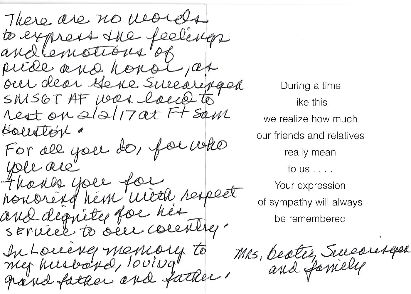 Thank You card from the Swearingen Family